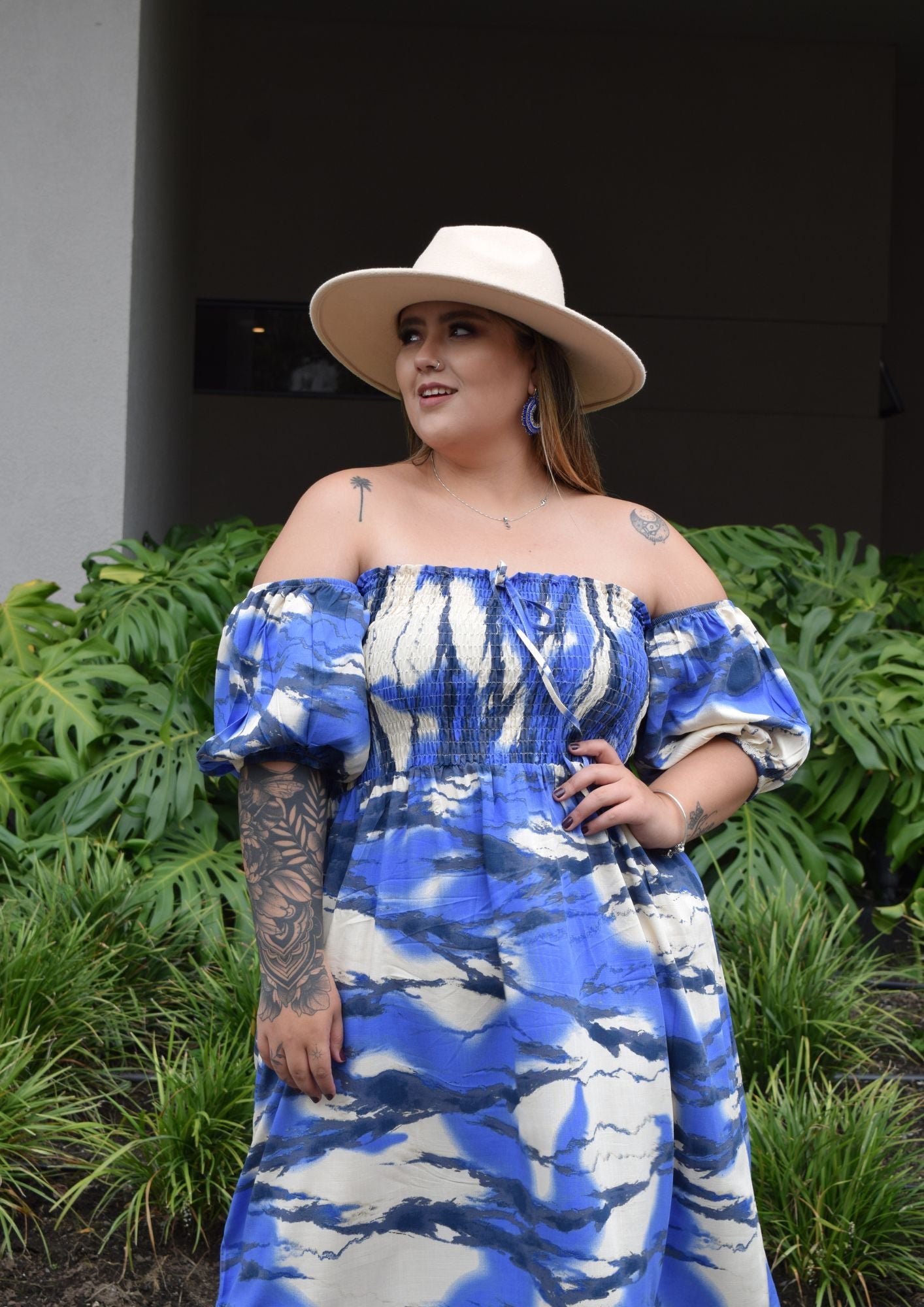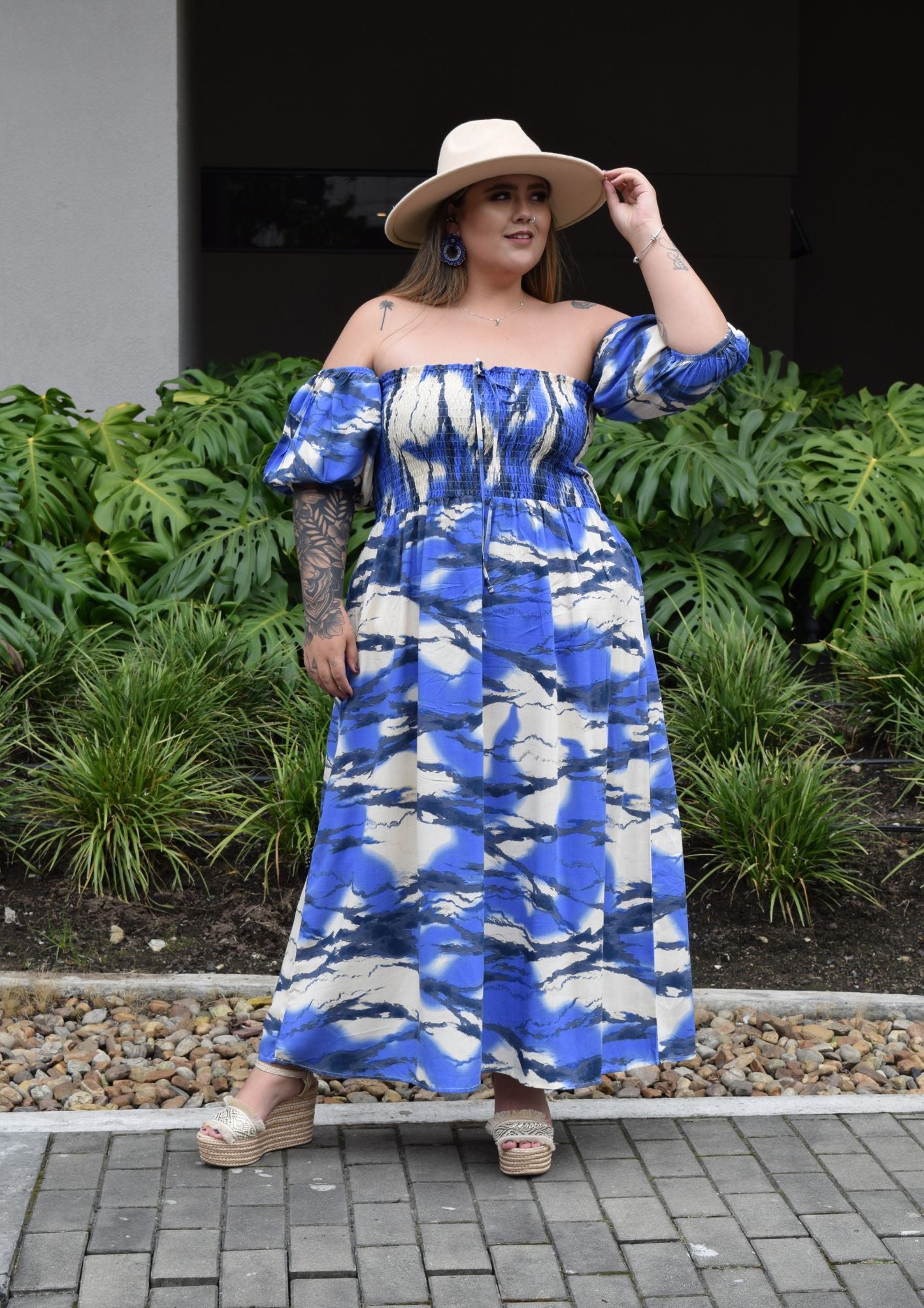 VESTIDO EN CHALIZ CON ESTAMPADO EN AZUL BEIGE Y NEGRO